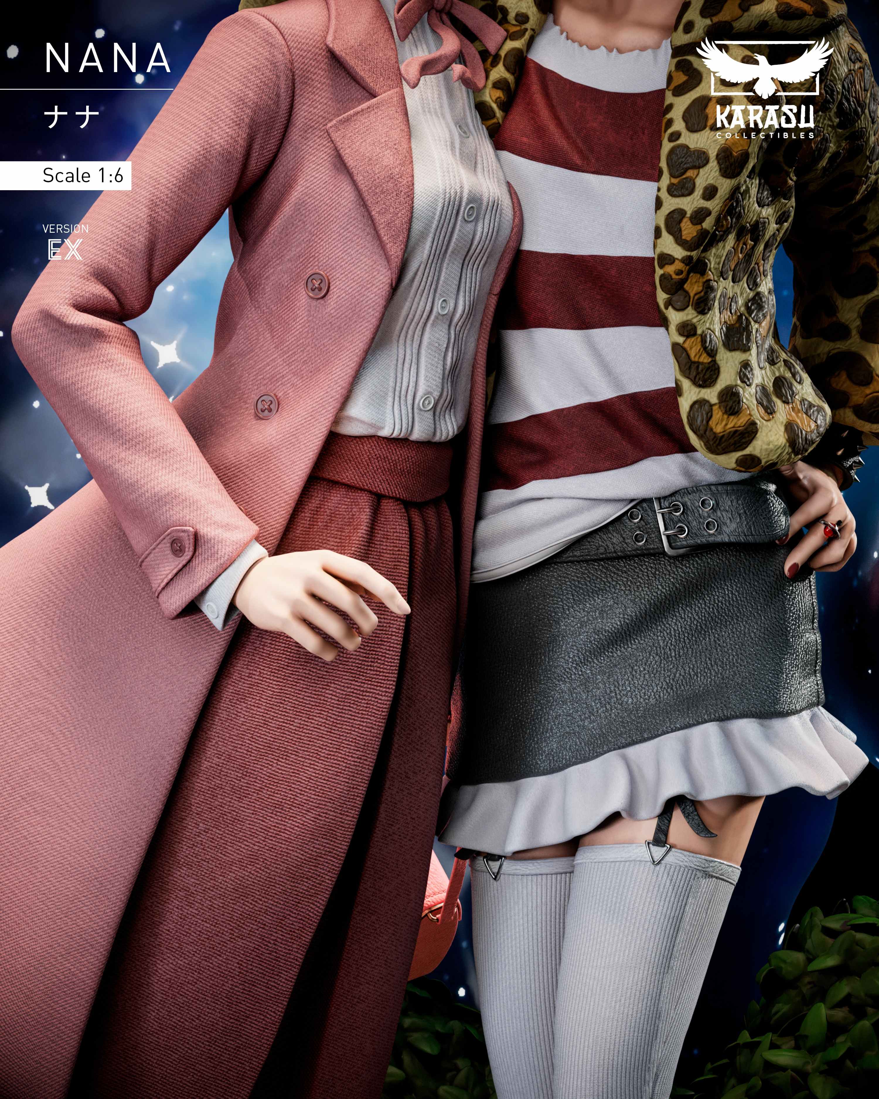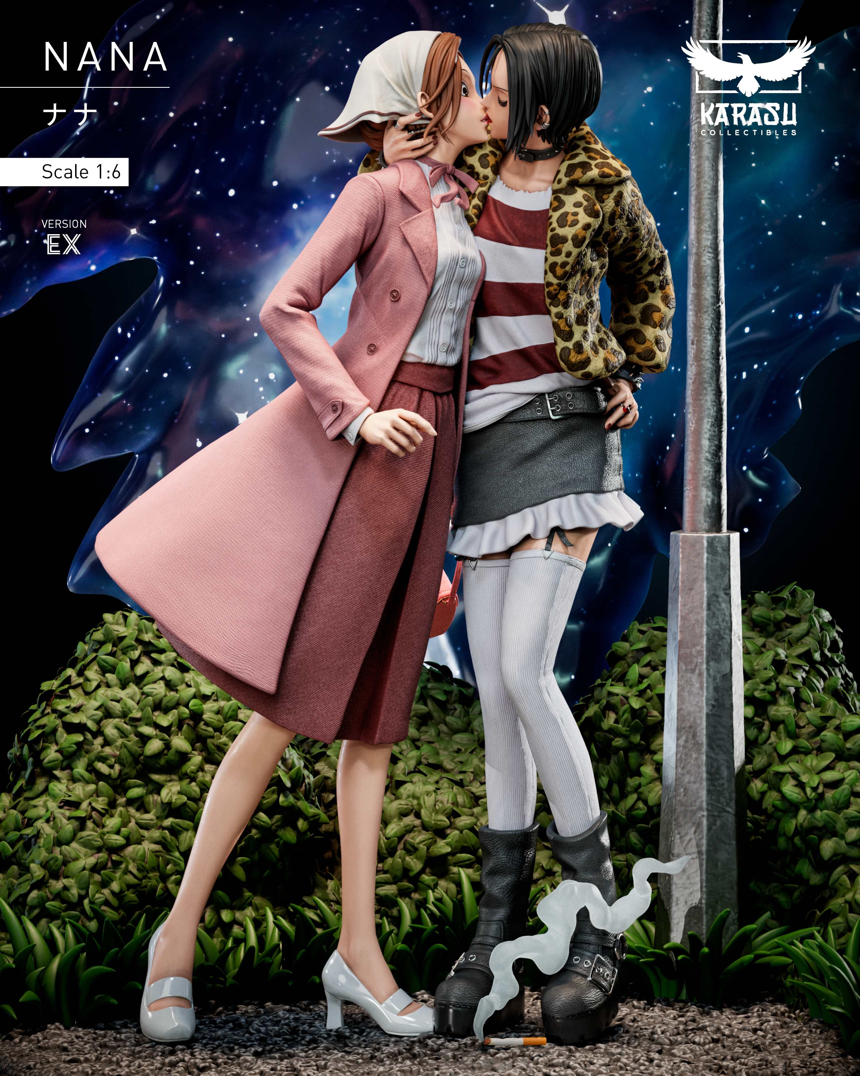 【NANA】預購商品 【團隊】:Karasu Collectibles 【名稱】:Hachi&Nana 【售價】: Regular版本:全款10990、訂金5495 EX版本:全款11990、訂金5995 (以上金額未包含國內外運費) 【尺寸】:1/6比例 【配置】:EX版本含有星空背景;兩種版本皆可亮燈 【出貨時間】:2026年第三季 (實際出貨日需以工作室通知為主)